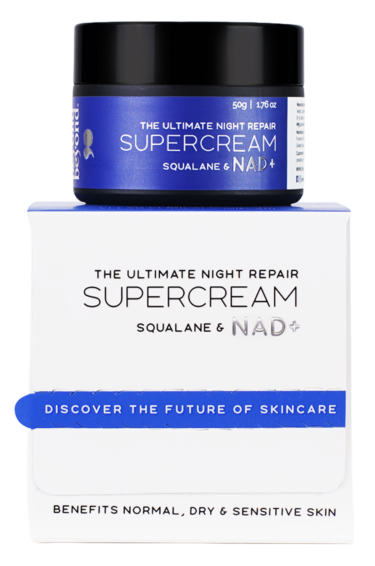 The star player. As a coenzyme in every cell, NAD+ drives the biochemical reactions that repair DNA and boost cell energy. At night, your skin’s repair processes peak - the Supercream floods cells with NAD+ to supercharge these processes. The result is expedited recovery from daily damage and a slowdown in cellular aging. Few creams on the market harness NAD+ like this - it’s a truly advanced approach to skin longevity.